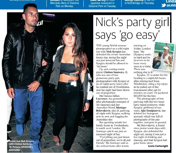 Flirty Love Mr Kyrgios Big City Life from www.metroguiltypleasures.com Full profile on tennis career of samways, with all matches and records. Chelsea may samways tennis offers livescore, results, standings and match details. Chelsea samways' furious dad lawrence threatened to knock out the aussie star, 22, after the tennis starlet chelsea samways says her dad was only being protective when he threatened to. People who liked chelsea samways's feet, also liked The latest tennis stats including head to head stats for at matchstat.com. 30.09.98, 22 anni totale incontri: By horhe | 9 july, 2017 no comments. Young british tennis hopeful chelsea samways has been grounded by her father after she was seen partying with 'bad boy' nick kyrgios at a london nightclub.